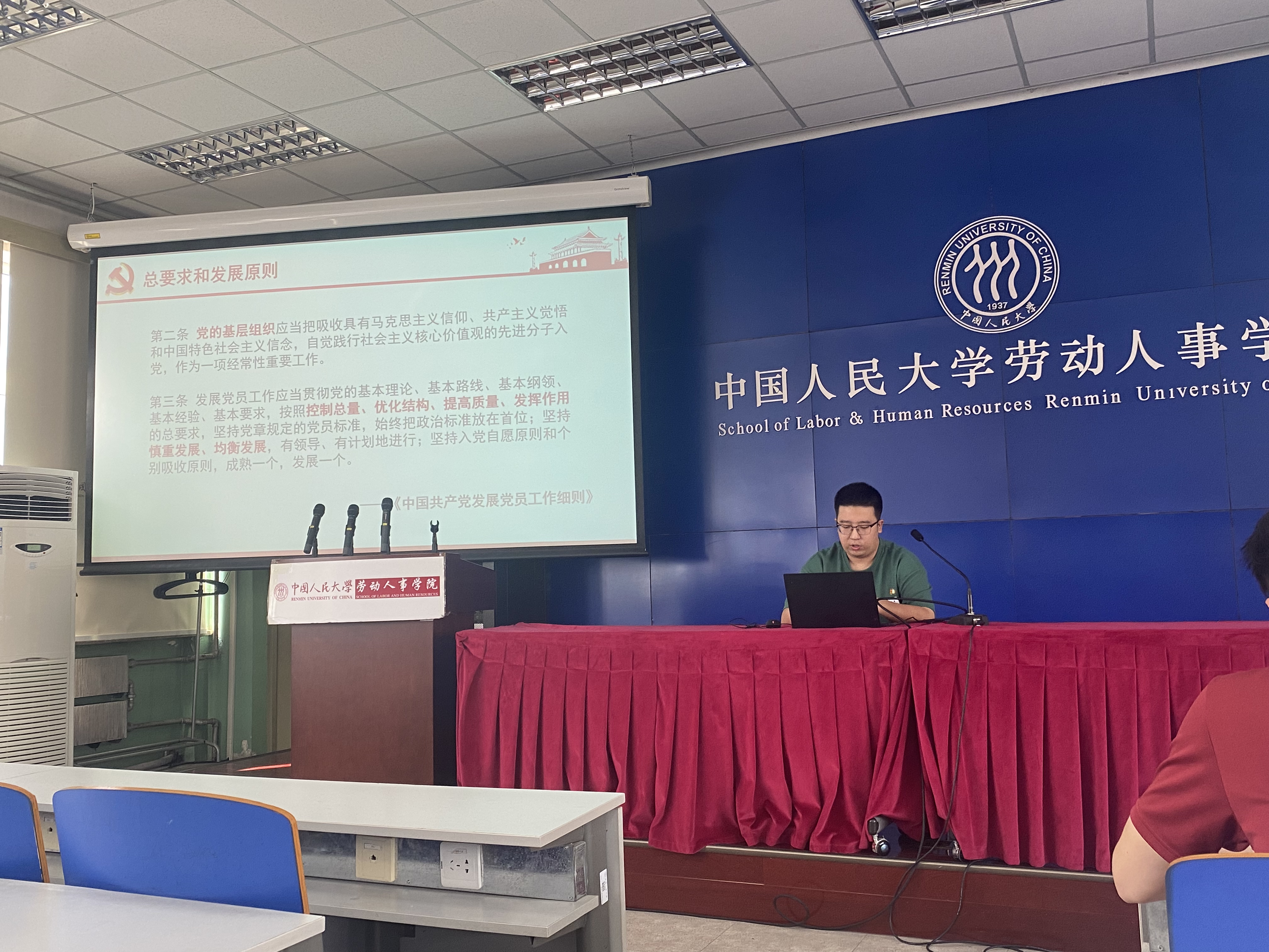 党员发展工作由卢思谦同志主讲。卢思谦首先从宏观视角介绍了党员发展的总要求和发展原则,并整体介绍了党员发展全过程。随后从申请入党阶段、入党积极分子的确定与培养考察阶段、发展对象的确定和考察、预备党员的接收和教育考察和预备党员转正五个阶段详细介绍了党员发展各个阶段的工作要点和材料要求。最后,卢思谦结合过往工作经历,指出党员发展过程中需要注意的细节问题。