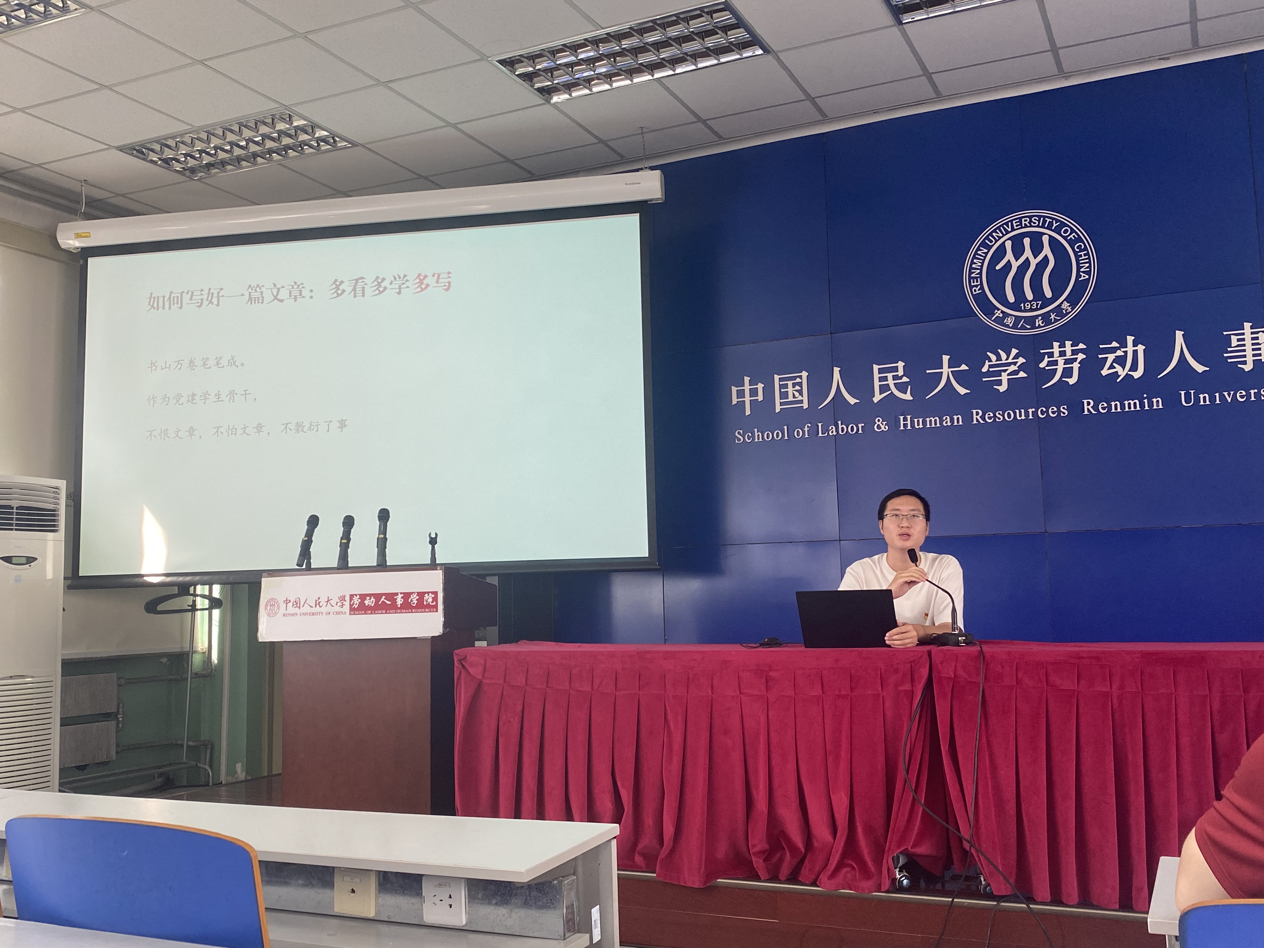 写作培训由王峥博同志主讲。王峥博首先指出文字写作作为一项非常重要的专业技能,具有重要意义,并从政治性、规范性和逻辑性三个方面介绍了文字工作的核心要求。在党建文字写作中要做到关键信息不错位,不缺位,紧紧围绕中心主题,兼顾表达的规范性和逻辑性。最后,王峥博向大家分享了平时培养写作能力的心得体会,号召参会同志在多看多学多写中不断提升自己的文字写作能力。