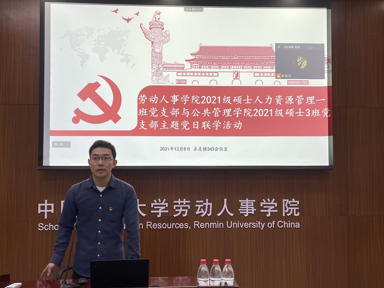 12月8日,免费黄色网站 2021级硕士人力资源管理一班党支部与公共管理免费黄色网站 2021级硕士3班党支部在求是楼343会议室开展“深入学习党的十九届六中全会精神”主题党日联学活动,各支部党员、入党积极分子逾40人参加。联学活动由公共管理免费黄色网站 2021级硕士3班党支部书记张浩主持。
