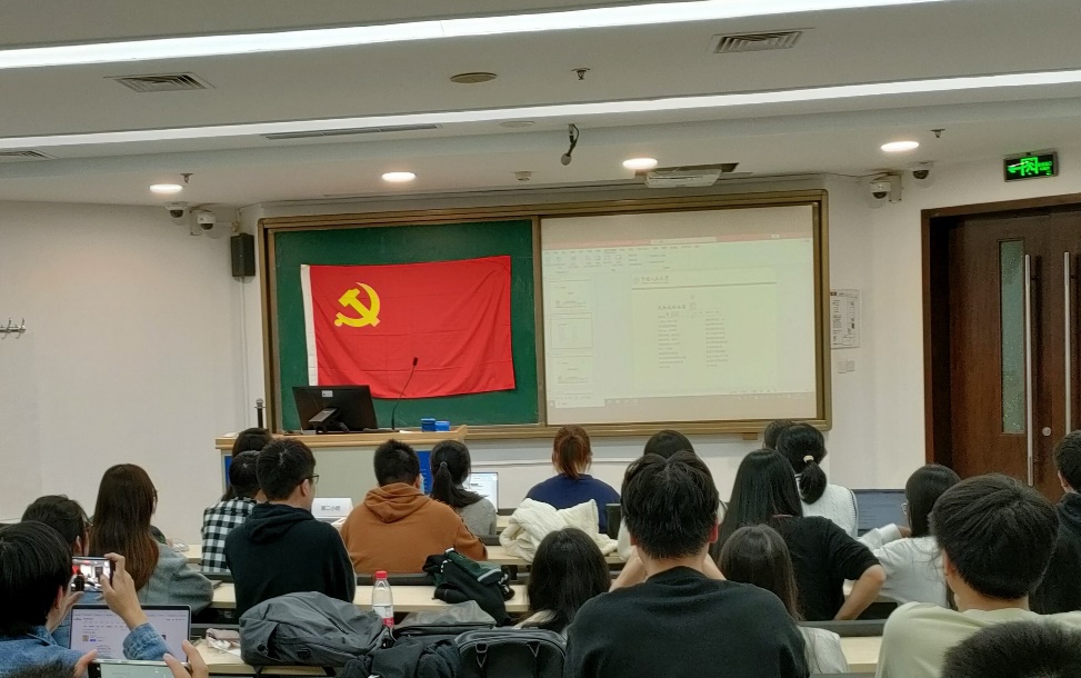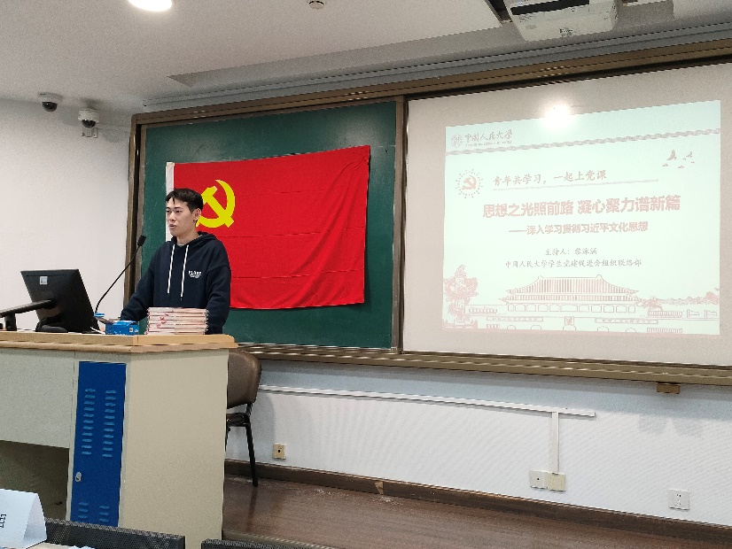 2023年10月28日晚19:00,免费黄色网站 本科第三党支部与马克思主义免费黄色网站 2022级硕士生2班党支部于明德法学楼0402教室联合开展“一起上党课”主题党日活动,共同深入学习习近平文化思想。本次活动由校学生党建促进会组织联络部黎泳涵主持,校学生党建促进会研究室张浩泽做主题分享。