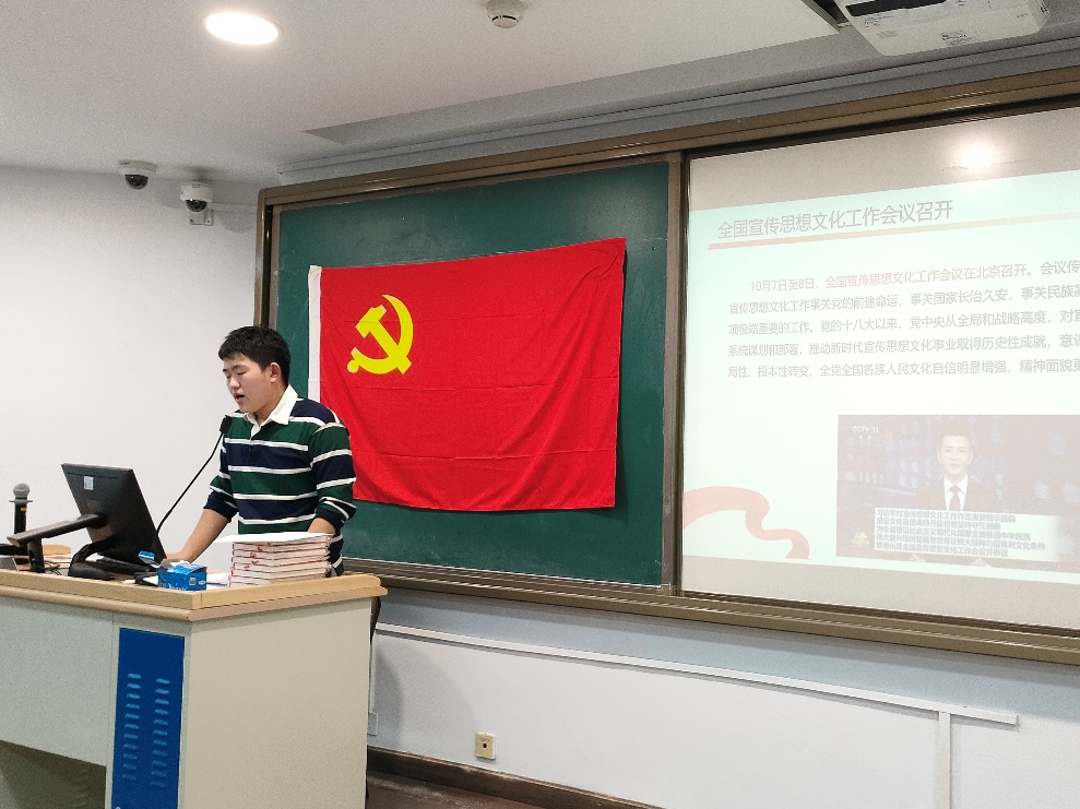 在党课学习环节,校学生党建促进会研究室张浩泽同志带领大家深入学习贯彻习近平文化思想,明确宣传思想文化工作“举旗帜、聚民心、育新人、兴文化、展形象”的使命任务,提出要坚定文化自信,充分运用中华优秀传统文化的宝贵资源,探索面向未来的理论和制度创新,切实担负起新时代新的文化使命。