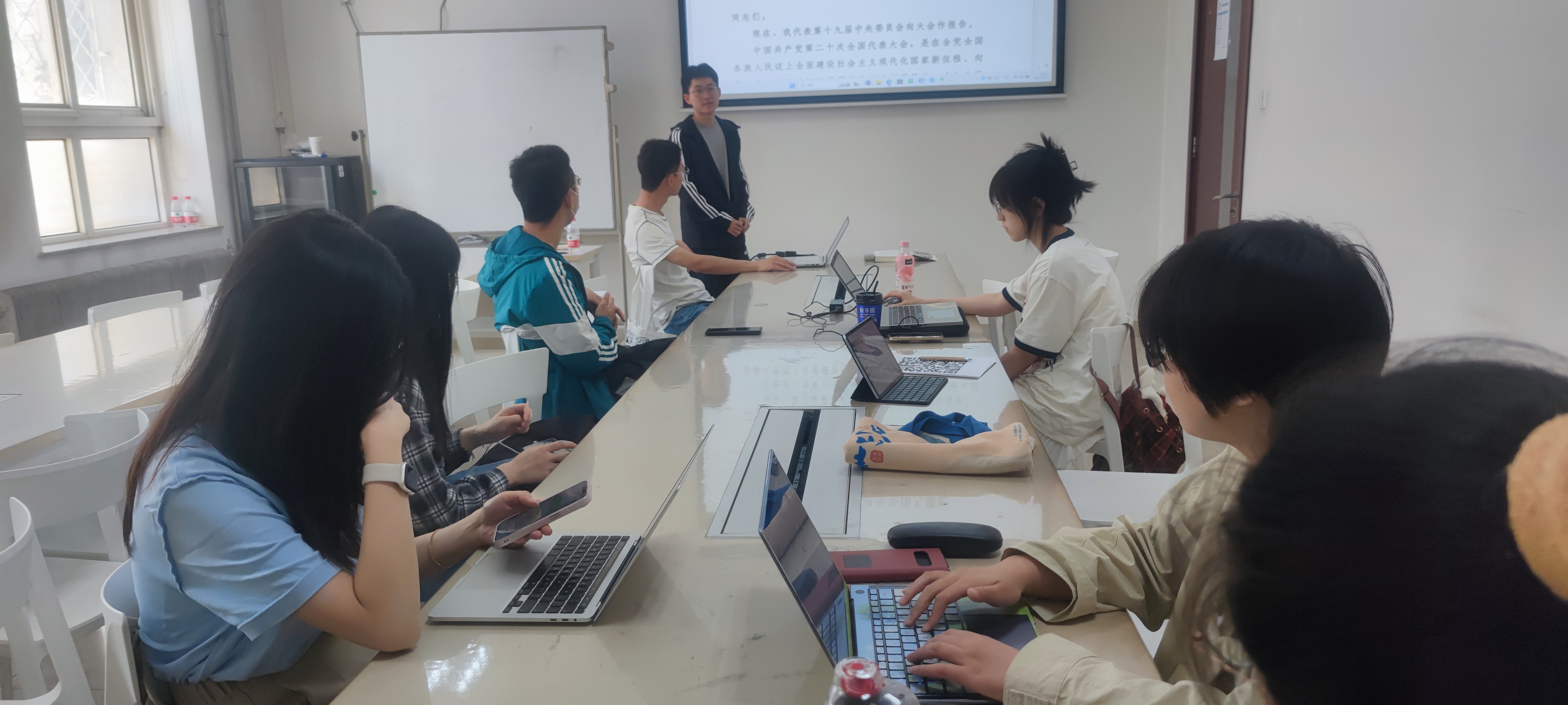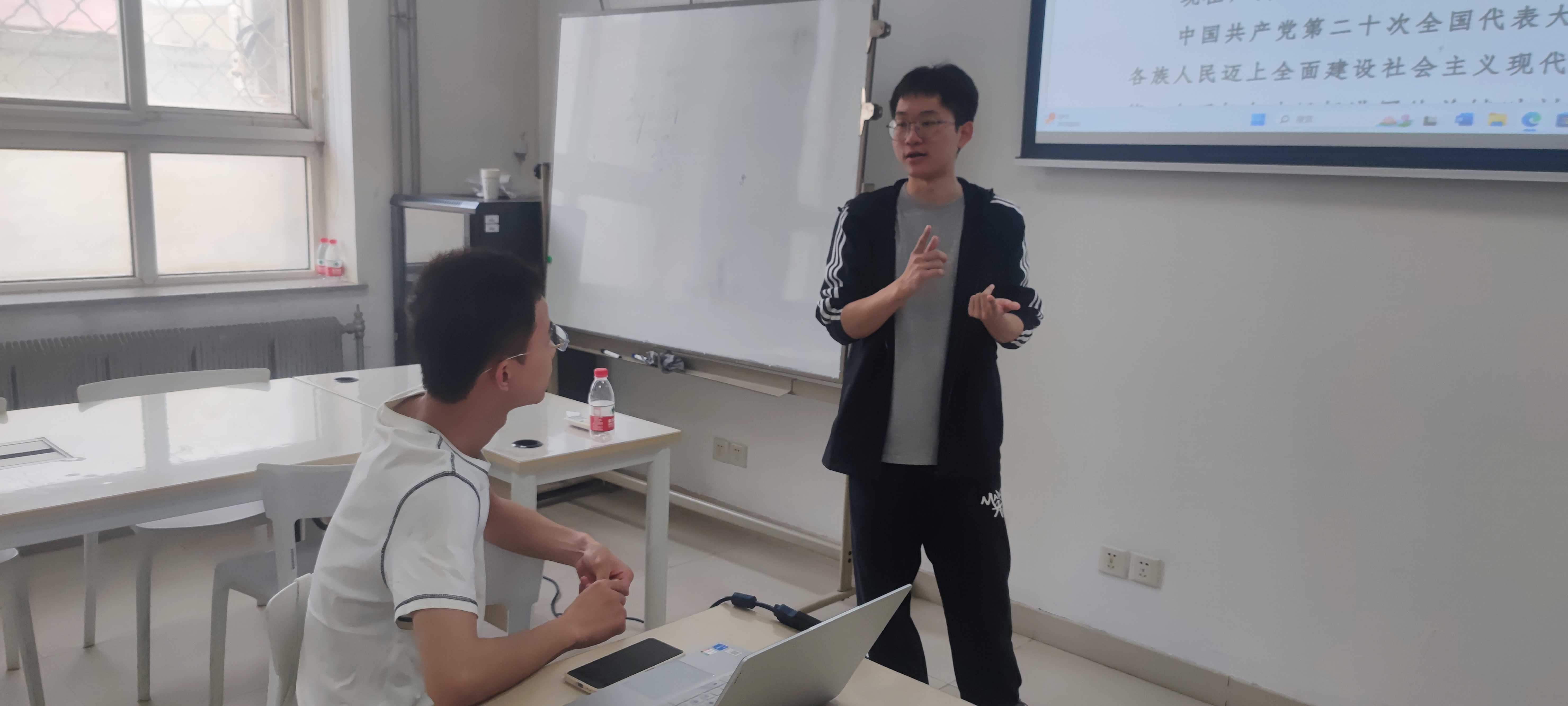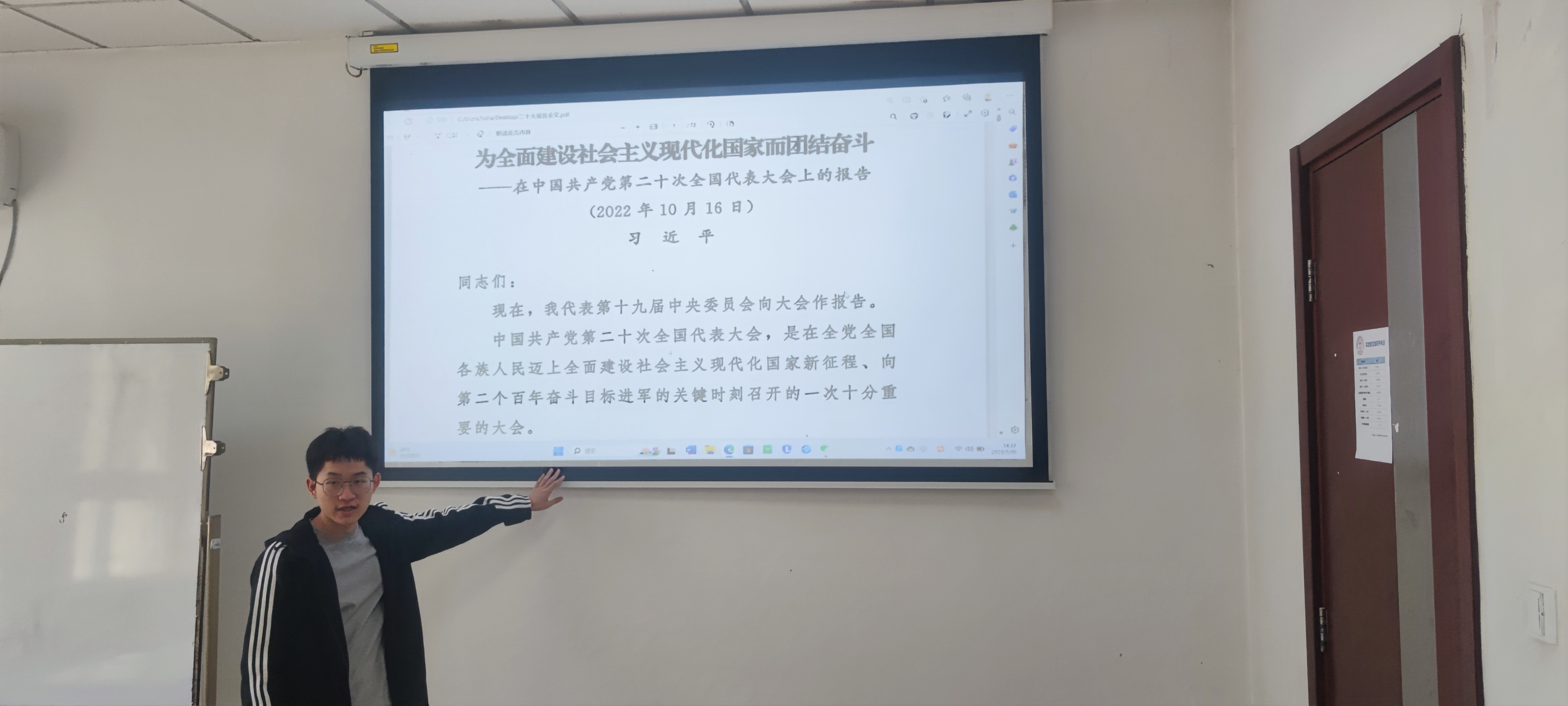 2023年5月10日下午,以“学思想悟原理,育栋梁争先锋为主题”的学习贯彻习近平新时代中国特色社会主义思想主题教育学生读书班第一期在求是楼119会议室顺利举行。首次读书班针对党的二十大报告开展交流分享。2021级人力资源管理一班党支部书记曾昊同志领学。来自多个基层学生支部的十余名学生党员、积极分子参与了本次读书班。