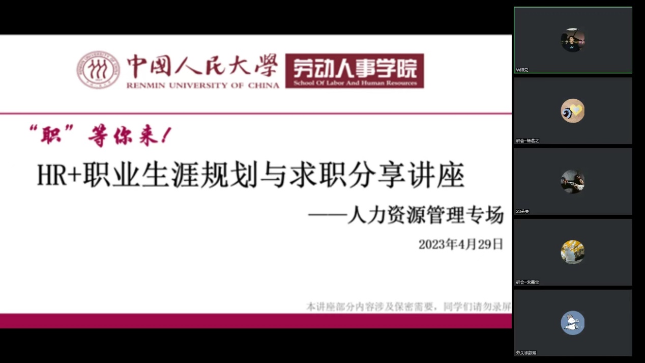 在4月29日晚举办的人力资源管理专场讲座中,2021级人力资源管理硕士王同学结合自身职业发展规划与定位经历鼓励同学们结合自身特点和想法,在不断尝试的过程中摸索最适合自己的职业发展历程,同时通过底层逻辑分析、举例事实论证的方法分析了国央企人力资源工作的特点。2021级人力资源管理硕士李同学介绍了自身选择互联网HR职业路径的原因,同时也为具有相近求职意愿的同学提供了offer选择过程中的方法论建议,最后分别从前期投递、暑期实习、正式求职三个阶段分享了需要注意的事项。2021级人力资源管理专业硕士付同学对金融机构人力资源工作的特点进行了解读与分享,同时结合实习经历及秋招经验讲述了自身在金融机构人力资源工作领域的成长历程及求职经验,并对目前同学们普遍关注的offer选择问题提出了建议。2021级劳动经济学专业硕士李同学分享了个人在人力资源咨询领域的实习及求职经历,从“观察企业的视角不同”这一特点出发,详细讲述了人力资源咨询方向的工作节奏、发展前景与转型路径等内容。