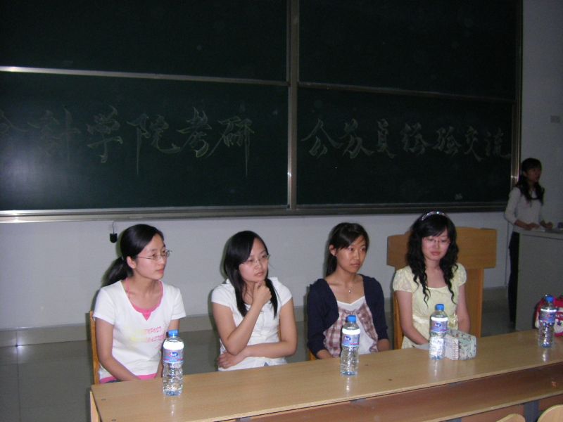 随后的公务员经验交流会上,顺利考入外交部的闫雪,烟台国税的邓力宁,潍坊税务的裴琮琮,龙口海关的李雪梅作为嘉宾为同学们讲解了公务员考试的复习准备和考试流程。她们就同学们关注的职位选择做了系统而详细的分析。另外,针对公务员考试的特点,她们建议同学们平时多看报纸,关注国内外时事。