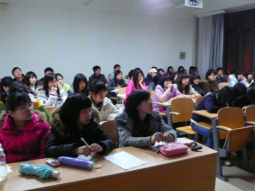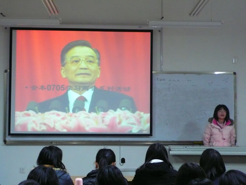 班会首先播放了温家宝总理09年政府工作报告的视频,所有同学认真观看,并不时记录重要讲话内容;此后,班长、团支书及党员代表就两会的一些焦点和议题发表了自己的看法与认识;最后,同学们对两会中和大学生联系最为紧密的大学生就业问题以及社会焦点三农、民生问题展开了热烈的讨论。