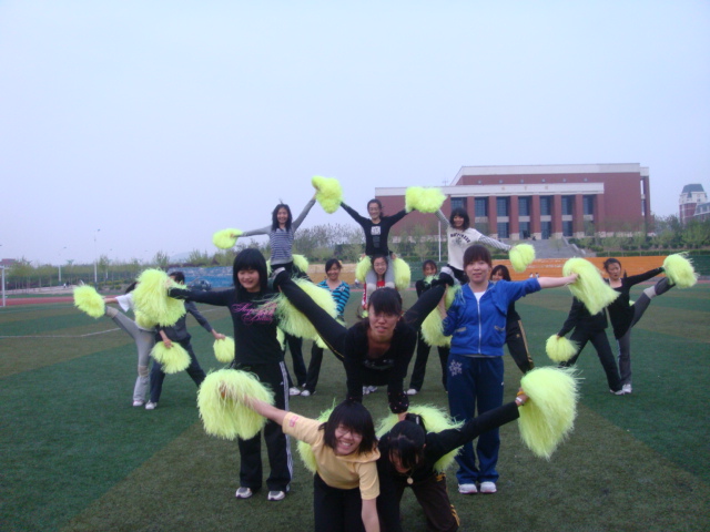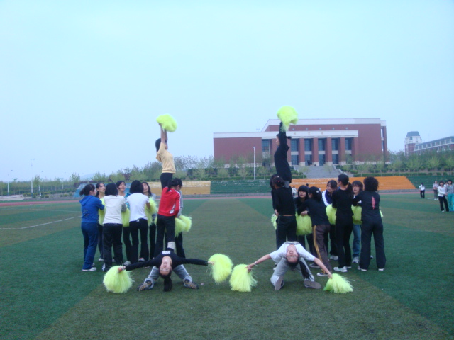 啦啦队由大一大二共20人组成,她们队形整齐,动作一致。为了一个动作的标准一致,她们不断的重复这个枯燥的动作,没有怨言只有乐观坚持。她们整齐的队形,统一的动作,让人赞叹。当音乐响起时,金黄色的啦啦花上下飞舞,青春活力与激情洋溢在这里得到了很好的结合。