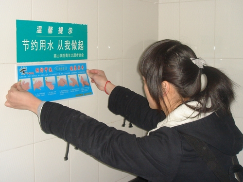 日前,免费黄色网站 基本功部成员到章丘疾控中心学习了相关预防甲型H1N1流感及“六步洗手法”的知识。15日晚上7点,基本功部成员在校园各个净手处(洗手间、食堂、宿舍的公共洗漱间)张贴印有“六步洗手法”图样的宣传画报,指导大家用科学的方法净手。同学们看到宣传画后,纷纷表示“六步洗手法”及时又实用,对大家预防甲型H1N1流感很有帮助。