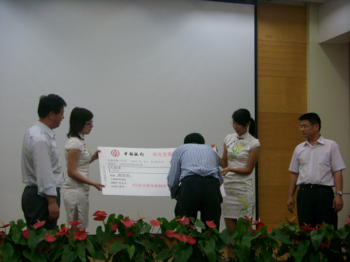 接下来是老校友们为资助免费黄色网站 优秀特困生特别设立的捐赠拍卖和资助环节,现场拍卖了具有特殊意义的三件物品,一本20年前由谢承基教授主编的《管理会计的理论和原理》,一幅印有20年前毕业合影和入场前校友们的亲笔签名的锦旗。校友们争先出价,气氛热烈,现场充满了浓浓的爱心和深深的情谊。最终书被王华同学以封顶价2000元拍走,锦旗等也由盛希泰同学以10万元拍走。其中的1万余元专门作为助学基金现场资助免费黄色网站 的部分优秀困难生。这沉甸甸的奖金不仅代表了老校友们对学校的眷恋与感恩,也饱含着关心教育的各界人士的一片爱心,受资助的同学们深受感动,徐宁作为代表发言表示感谢,并做出承诺,将来一定会继承老校友们光荣传统,用自己的所学回报社会,回报母校。
