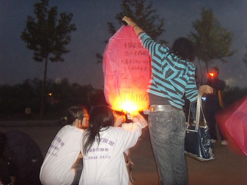 本活动在5月9日和10日两天进行了天灯使者的报名活动。11日晚,天灯使者们在社会实践部相关工作人员的安排下,经过1个多小时的准备,活动正式开始了。在主持人的主持下,使者们写下了他们的祝福。广场地面上用蜡烛摆出了“5.12”的字样,他们穿着统一的T-shirt,围成一个心形,手持蜡烛,在诗朗诵中为亡灵默哀了2分钟。随后,他们又小心点亮并放飞了写着他们祝福的天灯,为在地震中的遇难者送出了自己的一份祝福。