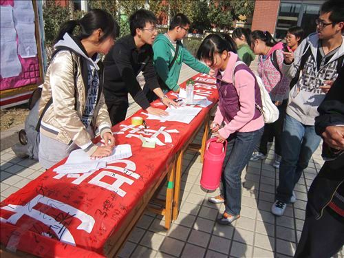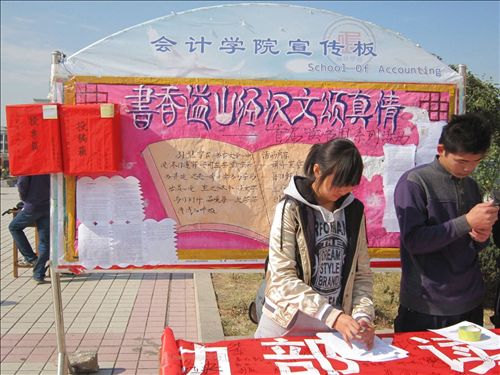 此次活动分为签名,“三行情诗”、“微型小说”投稿、“我最喜欢的十本书”投票和现场评比四个环节。旨在呼吁更多的同学参与到“读书周”的活动中,激发同学们读书的兴趣,从而学以致用,回报社会,报效祖国。8日中午,基本功部在明水校区两餐厅之间的广场发起了横幅签名活动,吸引了众多过往的同学前来参与,加强了宣传的力度,号召了更多的同学积极投入到“读书周”活动中。同时,有很多同学即兴创作“三行情书”和投稿“微型小说”,场面如火如荼。
