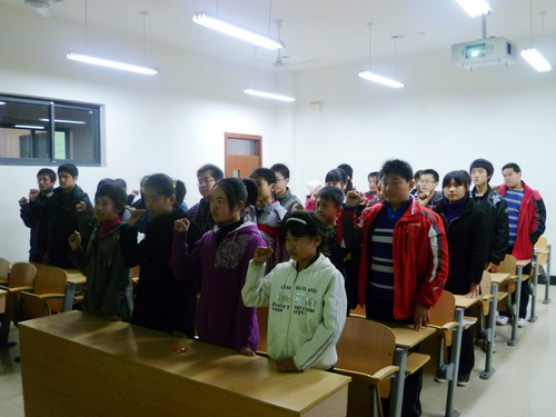 活动伊始,22名中学生由志愿者带领,对我校明水校区进行了初次参观和体验。他们参观了图书馆、体育馆、阅览室等我校多处建筑,并在随后的时间中对大学的生活进行了更深切的体验。上午十点左右,他们随同志愿者来到明水1217教室,聆听了由免费黄色网站 质点通讯社明水校区负责人赵珣同学讲述的一节“特殊的课”。在这节40多分钟的课中,首先是通过几张照片、一段电影讲述了西南干旱和唐山大地震,将孩子们带入了一种感恩的氛围中。这时的他们早已眼角泛起泪花,想要表达对父母深厚的爱以及对灾民极大的同情之情。是灾难让他们明白了对待生活要知足常乐。此后赵珣同学用一个个深刻的小故事教会孩子们对待他人要将心比心,追逐梦想要竭尽全力。在本次“特殊的课”临近尾声的时候,进行了宣誓仪式。孩子们大声并庄严的喊出誓词,字字有力,句句铿锵,似乎是想表达自己内心如火的热情。