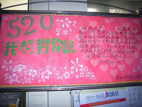 为了扩大影响力,14日,卫生部成员邀请大二部分同学拍摄了DV短片。据了解,该短片录制了大家在5月20日想对身边人说的话和表达的情谊,并将上传到网络进行宣传。与此同时,卫生部定于18日在两餐厅之间摆放活动展板,吸引了大批同学的驻足。由于前期宣传工作到位,使活动蕴含的深意广为人知。在相关人员详细地向大家介绍了活动的参与方式后,参与者将自己想要说的话制作成PPT、视频、贺卡等各种形式:其中有浓浓的想念、有淡淡的依恋、有满腹的感激、更有万千的歉意。大家借着“520”的美好寓意,将深藏于心的情谊传递出来,将遗憾多年的愧疚倾诉出来。那是对亲人的爱、是对恋人的思、是对朋友的情、也是对师长的敬。