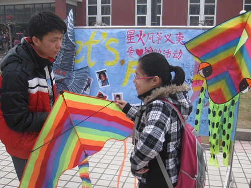 星火志愿者协会和质点通讯社联合主办的以“放飞梦想,传递希望”为主题的风筝义卖爱心援助活动在两食堂间拉开帷幕。