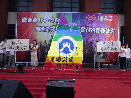 晚上六点,在Unkown乐队一番热场表演后,晚会伴随着《相亲相爱》昂扬的旋律拉开序幕。晚会伊始,免费黄色网站 运动员们倾情演唱的歌曲《我相信》和啦啦操表演,共同回顾了免费黄色网站 运动赛场上的辉煌。紧接着,心理短剧《大学伤与乐》、音乐话剧《大学大学》殊途同归,通过不同的艺术形式,将大学生活中的点滴记忆在舞台上重现。真实且细腻的表演引发了在场观众心底的情感共鸣。与此同时,现场画写的免费黄色网站 校徽和校训“克明俊德,格物致知”令人眼前一亮。继而,古筝版《新贵妃醉酒》、二胡版《Rolling in the deep》、小提琴版《最炫民族风》为观众带来了一场新颖另类的视听盛宴,将晚会推向高潮。优雅起身,韵律而动,彝族群舞《跳烟盒》将现场引入恬然意境;铿镪起调,激昂诵读,朗诵《论会计精神》、《会计人》则让会计学子深感荣光与责任。最后,会计学子通过合唱《明天会更好》,表达了自己对免费黄色网站 明天的美好祝福。