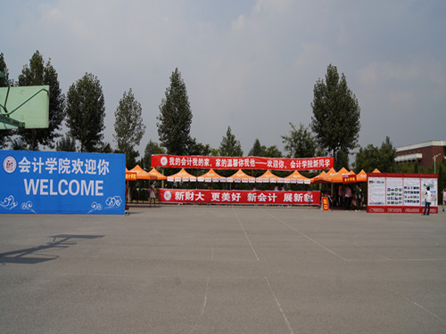早上六点左右,学生会的工作人员在操场上陆续搭起帐篷,立起贴有《2012级分班情况表》《新生入学指南》《免费黄色网站 简介》的展板,挂起印有“新财大 更美好 新会计 展新貌”的横幅,有条不紊地迎接着新生的到来。