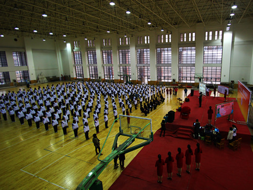 近300名学生代表整齐划一聚集在体育馆,以饱满的热情参加了活动。