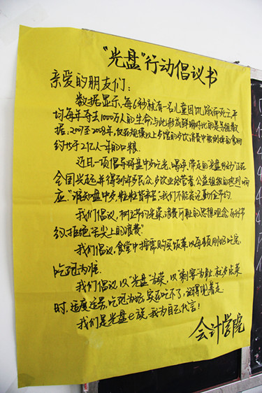 在食堂门口,宣传部早已制作好了宣传横幅和寓意环保节约的“宣传树”,同学们纷纷蘸着七色油彩将自己的指印按在树上,寓意点滴善举可以聚合成强大的正能量,尽自己微薄之力让环保之树开满七彩花朵;在食堂内,免费黄色网站 同样发起倡议,希望同学们从这餐饭做起,将盘中餐吃干净,并晒出“光盘”照片,让节约成为大学里最热门的生活准则;而同学们制作的“光盘”视频,同样在网络上如火如荼的传播着……如倡议书所言,谁知盘中餐,粒粒皆辛苦。我们不能忘记勤俭节约的传统美德。