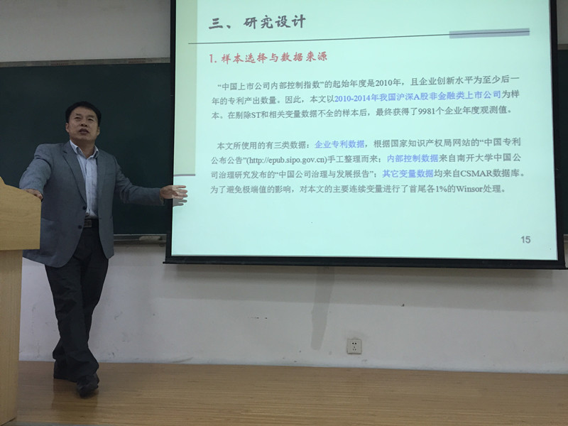 戴文涛教授以“内部控制在企业创新中的作用”为主题进行了此次报告,他从研究动机、研究问题、研究设计、实证成果及稳健性检验等五个方面对本次主题进行了全面而翔实的讲解。首先,戴教授叙述了自己研究这个课题的学术背景与国家发展对其的重点要求,引用专家观点,强调了内部控制在企业创新中的重要性,“公司治理与内部控制是现代公司制企业的两块基石,而内部控制更是相当于机器的协调系统,保证着企业的执行力和风险控制。”戴教授如是讲道。接着,戴教授就研究问题引出“抑制”和“促进”两个假说,解释了其中机理,并穿插了自己对于研究内部控制的经验观点。而后,戴教授运用多种数据、交叉变量及实证模型,向大家论证了“促进”假说的正确性,即内部控制水平与企业创新显著正相关。同时,他也指出其在创业板市场产生的负面效应,解释了内部控制的双面性,澄清了同学们对这个问题的误解。最后,戴教授简单介绍了内部控制的研究现状及研究方向,并对有意向有兴趣研究内控的同学表示了欢迎。