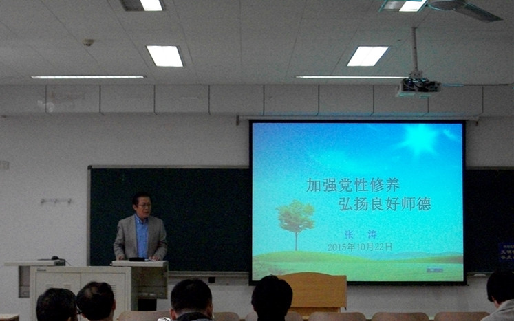 工作和教学实际情况,紧紧围绕“加强党性修养弘扬良好师德”的主题做了重要讲话。首先他带领大家共同学习和领会了刘兴云书记在2015年学校党建暨党风廉政建设工作会议上的讲话精神,提出要提高认识、明确责任,努力开创党建工作新局面。他指出要切实增强落实党员干部主体责任的使命感和自觉性,就要真抓实干。做到坚持立德树人,牢牢把握社会主义办学方向;完善运行机制,落实好党委领导下的校长负责制;下移工作重心,激发基层组织和党员队伍活力;持续改进作风,切实加强廉政建设;强化安全意识,构建平安、和谐校园。其次,他从正确理解党性,增强党性修养的角度出发,结合目前实际提出广大党员教师要加强理论修养、政治修养、道德修养、纪律修养和作风修养。他还结合刚刚出台的《中国共产党纪律处分条例》和《中国共产党廉洁自律准则》,强调了党员和领导干部必须严格遵守廉洁自律八条规范。最后,张书记针对目前教学中存在的实际问题,围绕新时期如何做一名好的大学教师,如何树立师德,做了深入的阐述。他指出大学教师应具备崇高的师德风范,常怀修德之心、常施关爱之心、常存仁慈之心;教师应具备基本能力、教学能力、教育能力、教研与自我发展能力以及教学改革与创新能力;教师还应具备责任心、亲和力、严谨教风、深厚功底和诚信谦和的素质。只有从诸多方面自我反省、自我提升才能称得上一名好的大学教师。
