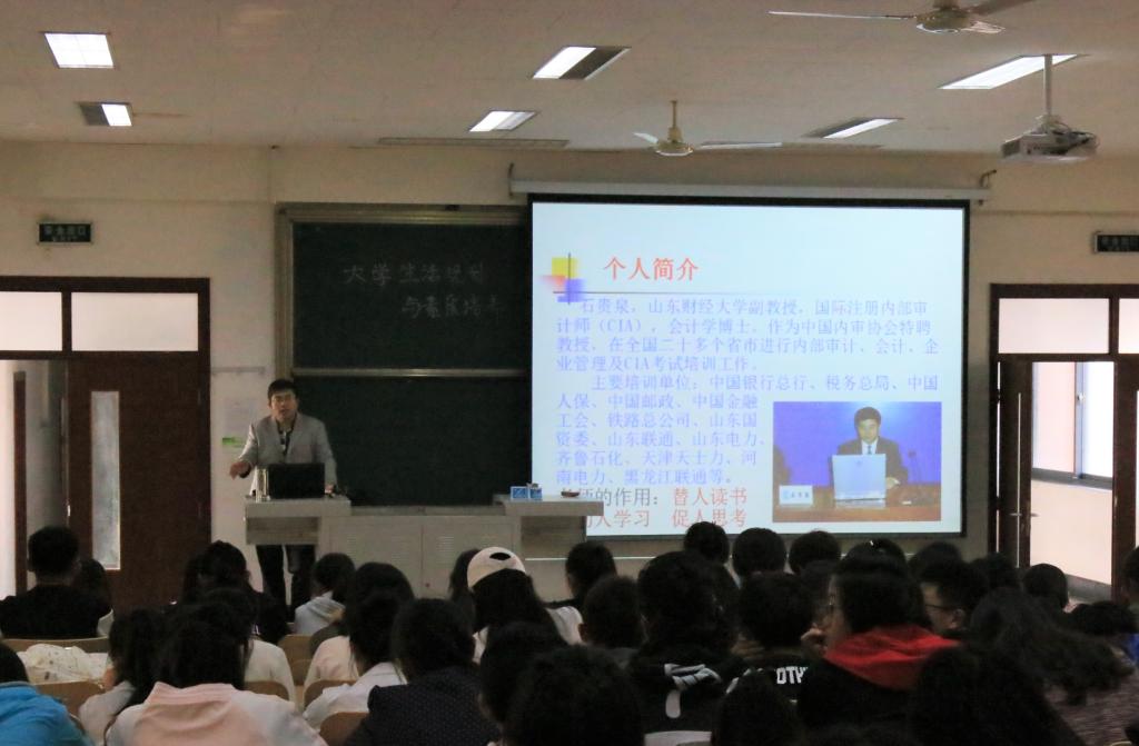 石贵泉老师不仅担任我校免费黄色网站 会计信息化系主任,教学经验丰富,更是国际注册内部审计师,山东省财政厅内部控制咨询专家团队成员,全国知名内部审计培训咨询专家,是我校少有的理论教学和实务培训兼优的“双师型”专家。多年来他以会计信息化、内部审计、风险管理和内部控制为主要研究方向,收获颇多。本次讲座他带着自己丰富的阅历与2017级免费黄色网站 审计系的新生就“大学生活规划与素质培养”展开了热切的讨论。讲座开始,石贵泉老师对大家进入免费黄色网站 学习表达了热情的欢迎,同时他也鼓励同学们要珍惜大学时光,努力奋进!石贵泉老师表示,学习贯穿人的一生并且发挥着极其重要的作用,因此希望大家能明白学习的重要性,树立终生学习观念,多去聆听老师、学姐学长等前辈的建议,少走弯路,吸取经验,认真规划人生,不负青春!