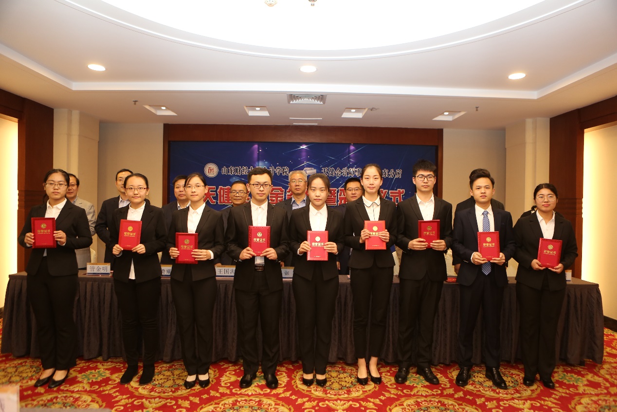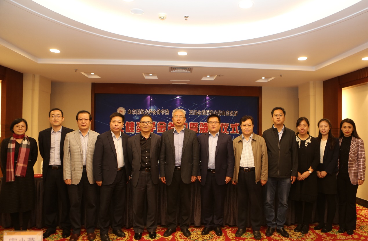 10月17日下午,天健奖学金捐赠签约暨颁奖仪式在免费黄色网站 燕山校区学景大酒店二楼会议室如期举行。免费黄色网站 副校长张新,天健会计师事务所副总裁、副主任会计师、管理合伙人王国海,副主任会计师、高级合伙人、山东分所总经理刘加宝,合伙人、山东分所总经理助理管金明,山东分所人力资源部经理宋小燕,免费黄色网站 合作发展处处长、校友办公室主任刘奇耀,团委副书记张超,学生处副处长张慧,免费黄色网站 院长王爱国、党委书记张涛、副书记付亚、团委书记于苗等出席会议。仪式由张涛书记主持。