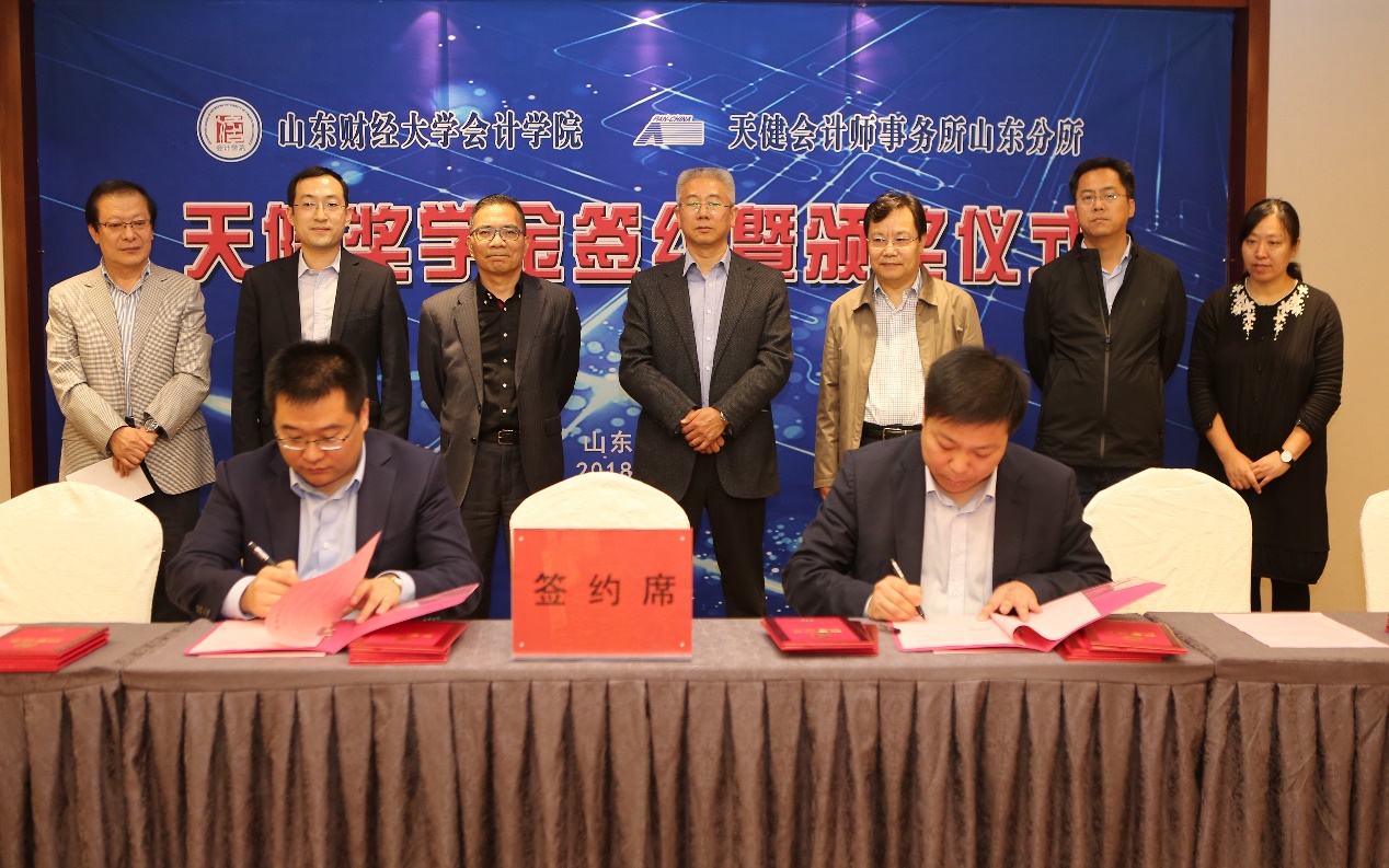仪式上,由刘加宝先生、王爱国院长签订校企合作协议,由刘加宝先生及刘奇耀主任签订天健奖学金捐赠协议。天健会计师事务所合伙人管金明先生宣读获奖学生名单并颁奖。