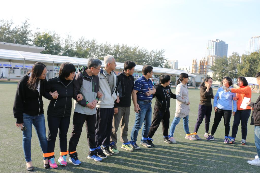 随后进行的活动是两人三足,这是大家在学生时代再熟悉不过小游戏了!只见老师们自觉地找到分组,绑好绳带。随着裁判的一声令下,出乎意料地是大家开始横向行走,原来这是加强版两人三足活动,但是显然难度的增加没有影响到老师们的发挥,大家齐心协力喊出的“一二一二……”下,迅速到达终点,展现了极高的团队协作能力和默契度。