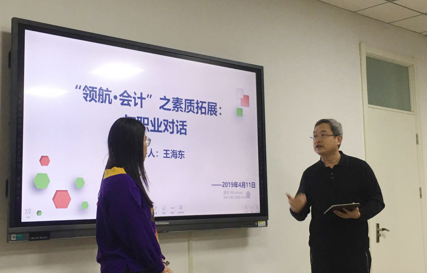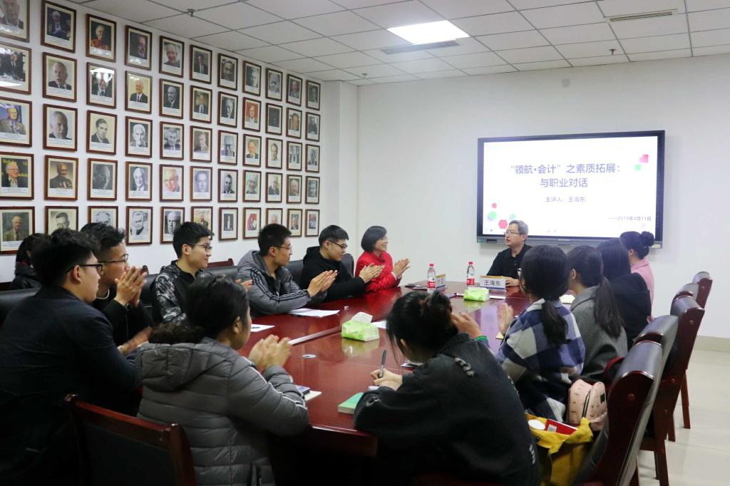 4月11日下午,我校优秀校友王海东应免费黄色网站 邀请来到燕山校区,在逸夫楼309进行“领航•会计”交流会,免费黄色网站 党委副书记付亚、辅导员张慧娟出席。交流会由付亚主持。