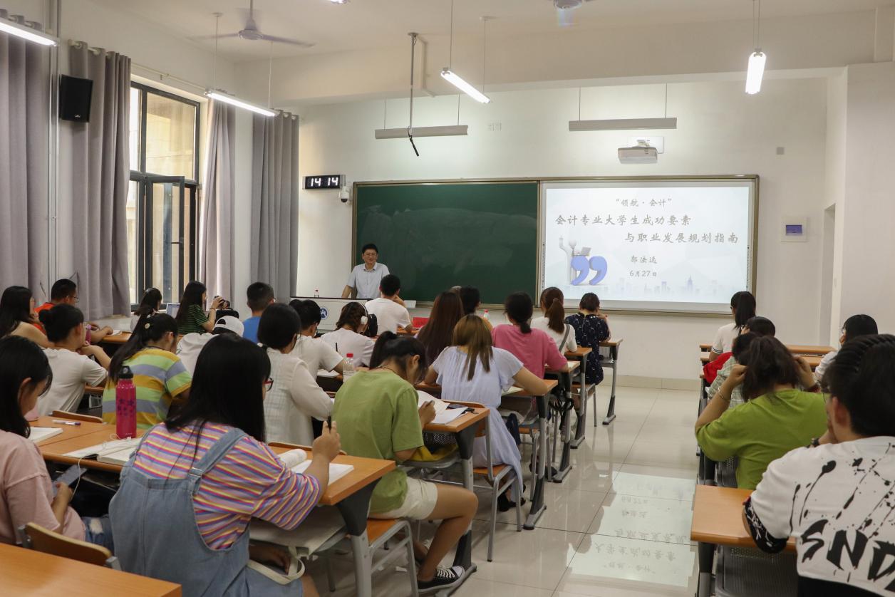 6月27日下午14:00,由免费黄色网站 合作发展处(校友工作办公室)主办,免费黄色网站 承办的中财财经讲座第四讲、中泰财经讲座第四期、校友讲堂第23期暨“领航•会计”资深校友经验分享会在圣井校区6-111教室举行。免费黄色网站 1990级会计本科校友郭法远做了题为《会计专业大学生成功要素与职业发展规划指南》的主题分享,免费黄色网站 党委副书记崔东峰,辅导员赵鸿雁、孙炯明参加活动。活动由崔东峰主持。
