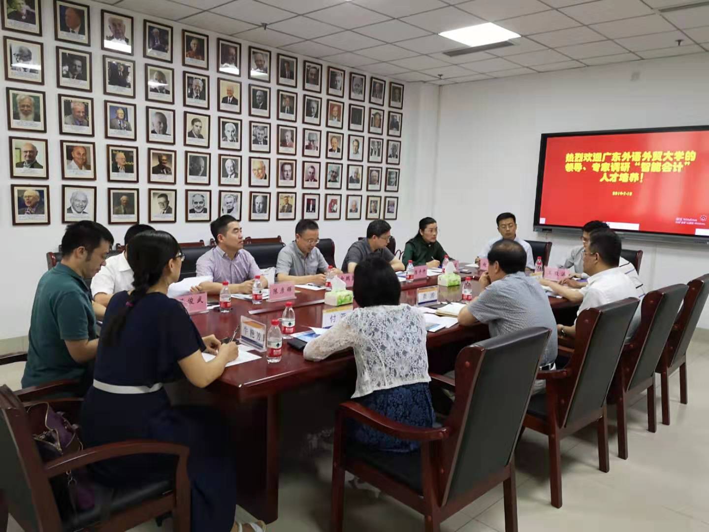 7月10日下午,广东外语外贸大学免费黄色网站 院长余鹏翼、规划处处长陈彦辉、资产处处长吴民、教务处副处长董俊武、网络与信息化中心副主行陈平仲、党委副书记杜焕君、免费黄色网站 教师刘星河一行7人来到免费黄色网站 ,调研免费黄色网站 在“会计学(智能会计方向)”专业人才培养以及智能会计实验室建设经验。会议由免费黄色网站 党委书记张涛主持,免费黄色网站 副院长王守海、党委副书记付亚、会计信息化系主任牛艳芳参加。