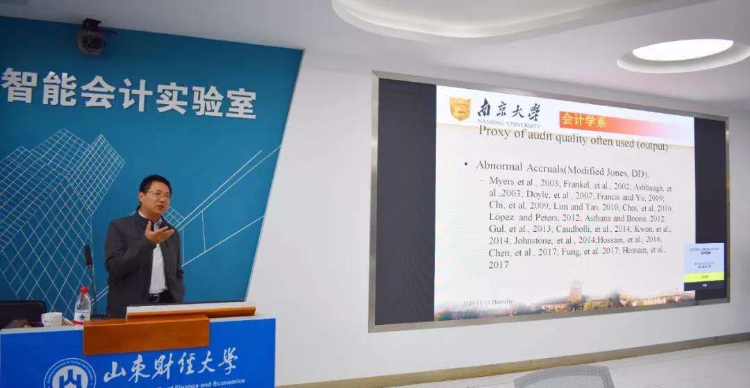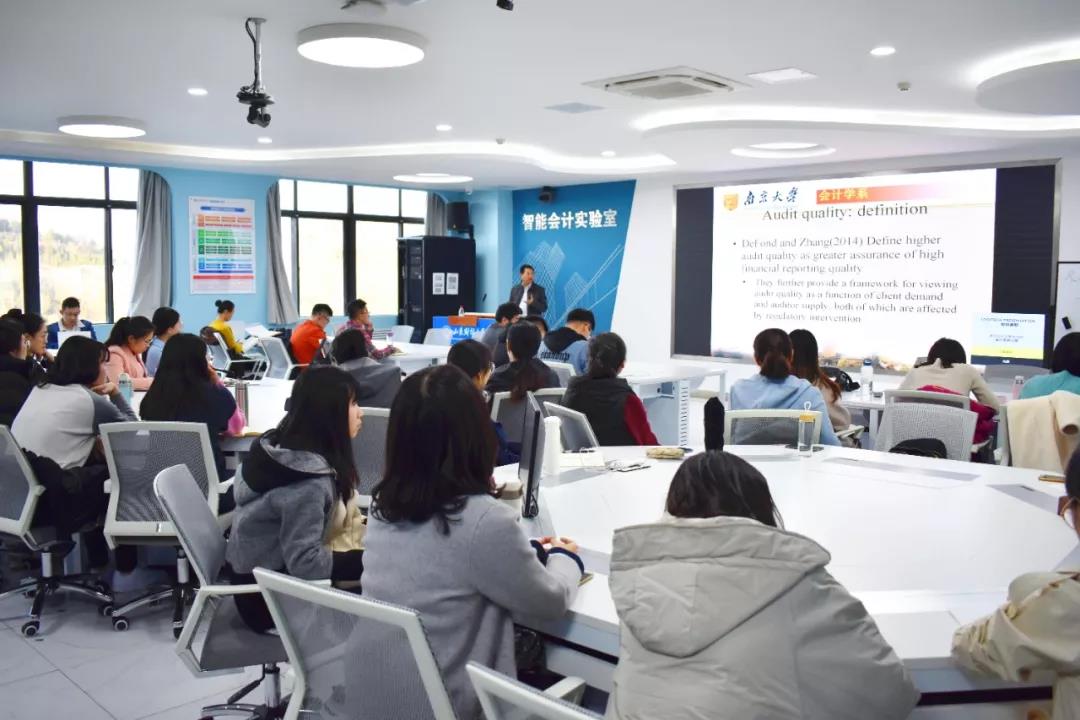 11月14日下午,值校友节之际,免费黄色网站 特地邀请昔日校友、现任南京大学商学院会计学系教授及博士生导师的李明辉教授作题为《独立审计质量研究》的学术报告。该讲座由免费黄色网站 副院长孙文刚主持,免费黄色网站 部分老师及2018、2019级部分硕士研究生到场聆听。李明辉教授兼任中国审计学会理事,主要致力于审计学教学与研究方向。