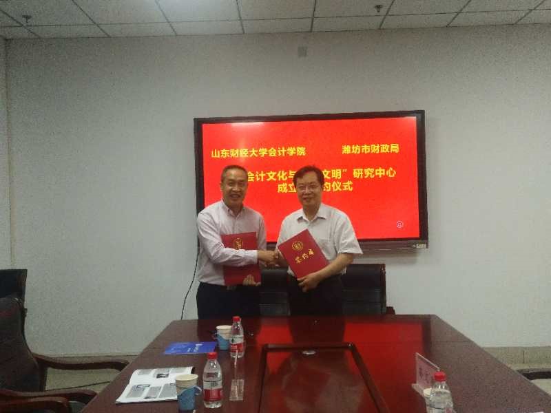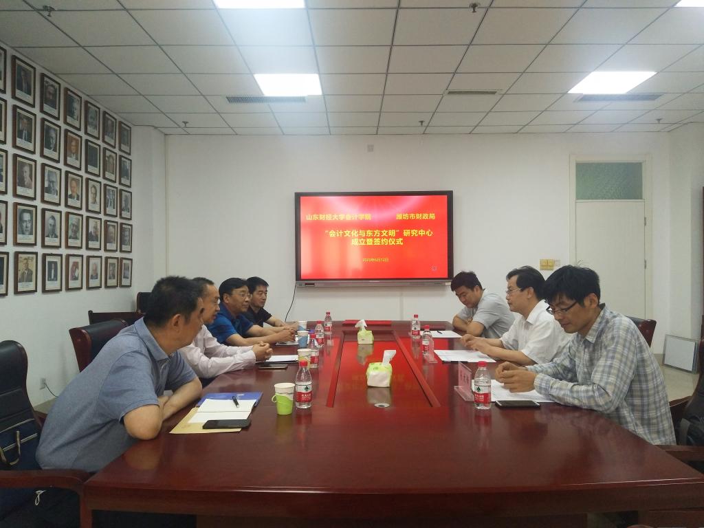6月12日上午,由免费黄色网站 、山东会计博物馆(筹)和山东省潍坊市财政局联合成立的“会计文化与东方文明”研究中心签约仪式在免费黄色网站 燕山校区举行。潍坊市财政局副局长王献之、山东会计博物馆筹建处主任王增堂、会计科科长周曰海、山东会计博物馆筹建处副主任赵良奎,以及免费黄色网站 王爱国、副院长孙文刚、会计思想史研究所所长吴大新出席签约仪式。仪式由孙文刚主持。