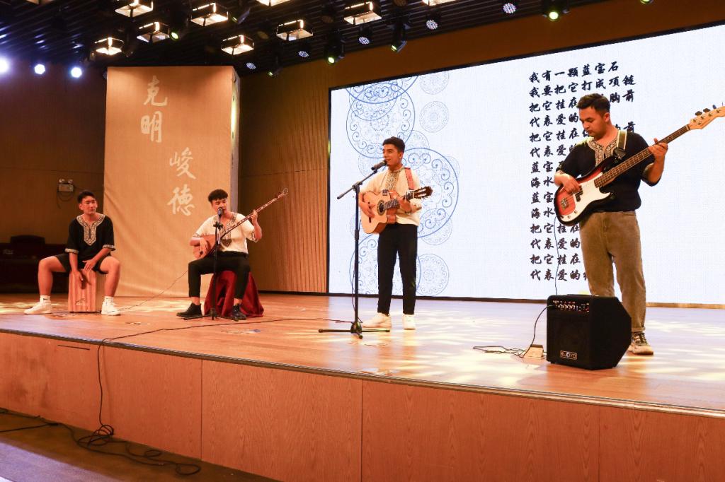 第三篇章“声磐同音”。动感的音乐响起,伴随着炫目的灯光效果,身着各族华美民族服饰的同学接连走向舞台,民族服饰走秀《同心掬得满庭芳》带我们领略不同民族的服饰文化;舞蹈《达坂城的姑娘》透过优美的舞姿映照出情同手足、浓浓的民族情谊,气氛瞬间感染全场,台下欢呼声、掌声经久不息。