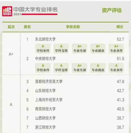 2021年,学院会计学、财务管理、审计学和资产评估四个本科专业全部进入2021年软科中国大学专业排名A类。在会计学专业排名中,共有332所高校上榜,会院会计学专业位列第53位;在财务管理专业排名中,共有370所高校上榜,会院财务管理专业位列第36位;在审计学专业排名中,共有102所高校上榜,会院审计学专业位列第5位;在资产评估专业排名中,共有44所高校上榜,会院资产评估专业位列第4位。