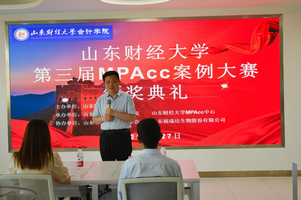 朱德胜教授对本次颁奖典礼致辞,介绍了本届案例大赛情况,向山东省注册会计师协会和山东福瑞达生物股份有限公司对本次案例大赛的支持表示衷心感谢,积极推动免费黄色网站 (MPAcc中心)与合作单位之间建立全方位多层次战略伙伴关系,希望行业协会和福瑞达集团不仅支持我校学生案例调研与实习锻炼,更要为我校毕业生就业提供更多优质岗位资源,助力我校毕业生就业工作高质量发展。