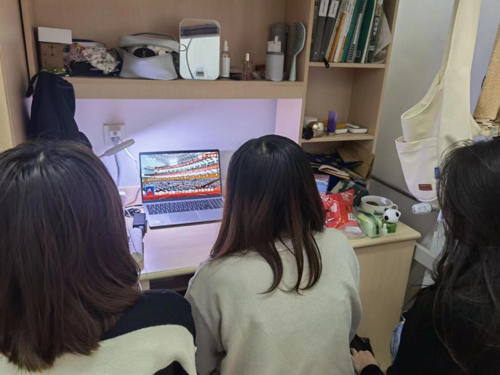 班干部、学生会成员等学生骨干在圣井校区6214教室集中收看收听开幕会盛况。