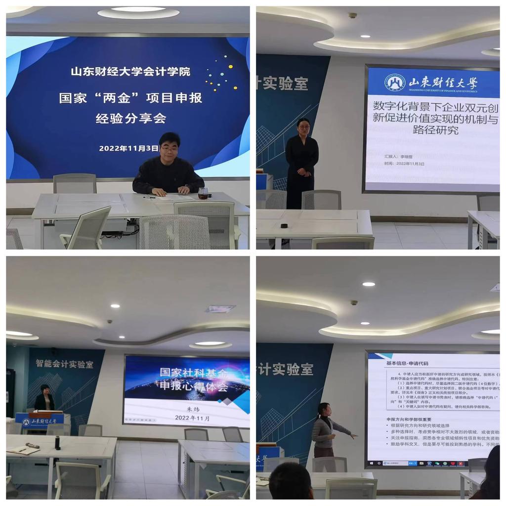 为持续推进有组织的科研,不断提升教师科研水平,推动学院国家“两金”项目申报工作,免费黄色网站 于11月3日下午在智能会计实验室举办国家“两金”项目申报经验分享会。学院党委书记邵文涛、副院长王守海及青年教师参加了活动;院长葛永波、财务管理系主任朱炜、智能会计系副主任李瑞雪和会计学系宋蕾蕾分别介绍了申报国家社科、国家自科的学术历程和经验。分享会由副院长吴大新主持。