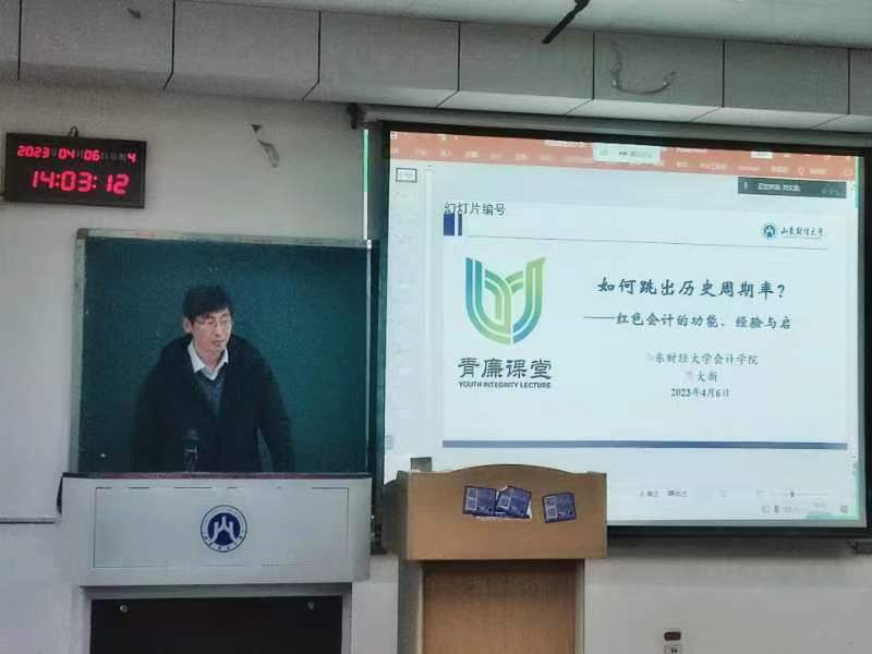 为全面贯彻党的二十大精神,进一步加强新时代廉洁文化建设,按照学校纪委监委推进廉洁教育、开展“青廉课堂”建设活动的要求,2023年4月6日下午,免费黄色网站 党委委员、副院长吴大新教授在逸夫楼Y403作题为《如何跳出历史周期率?——红色会计的功能、经验与启示》的专题讲座。免费黄色网站 2022级全体学术硕士研究生聆听了本次讲座。