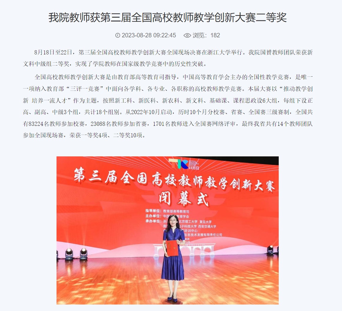 5.支持教学创新大赛。秉承“以赛促教、以赛促改、以赛促优”的理念,学院教师获得首届山东省教学创新大赛省级二等奖。在山东省第二届教学创新大赛和全国教学创新大赛中,获得省级一等奖和全国二等奖。在校级青年教师教学大赛中,获得校级二等奖。