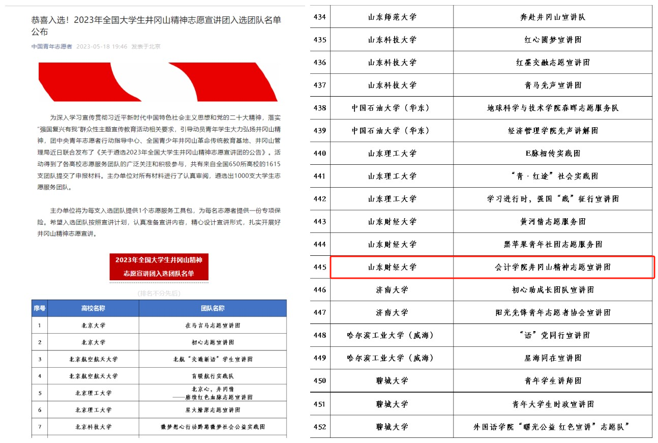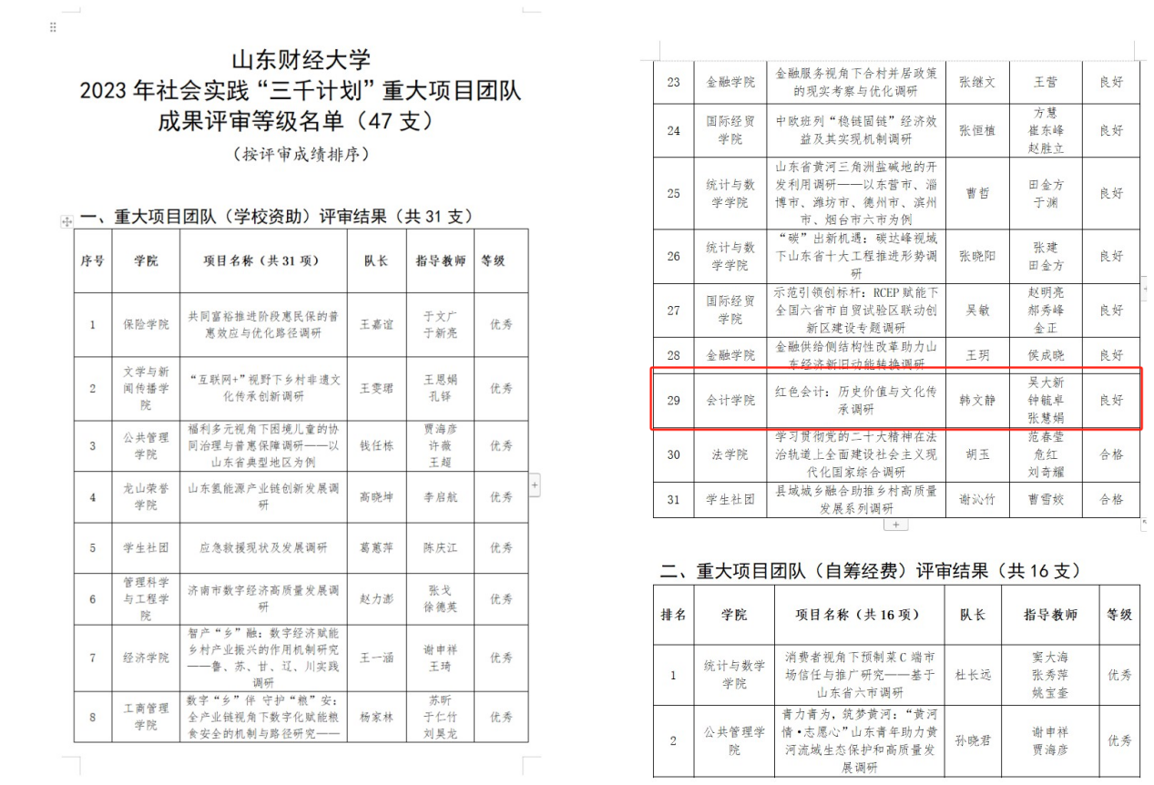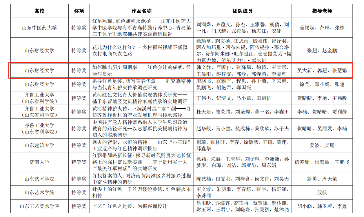5.传承红色会计,培育时代新人。免费黄色网站 井冈山精神志愿宣讲团入选由团中央组织的“全国千支大学生志愿宣讲团”。“山东省红色会计文化遗产的发掘、整理、保护与传承调研团队”和“免费黄色网站 红色会计——历史价值与文化传承调研团队”2个重大立项调研团队,指导教师带领学院120余名学生进行实地调研,找寻红色印记,发掘和传承“红色会计”历史文化遗产。《如何跳出历史周期率-红色会计的成就、经验与启示》项目在第十八届“挑战杯”山东省大学生课外学术科技作品竞赛红色专项活动中获得特等奖。