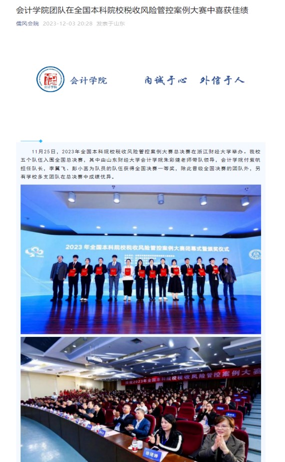 5.积极推进研究生导师指导能力提升计划,成果丰硕。立项1项校级研究生教育教学改革项目,1项推荐参评省级研究生教育教学改革项目,立项3项校级研究生教育主题案例,1部研究生教材(《MPAcc案例教学与应用》)获评省级一流教材;《中国情境下专精特新企业自主创新之路》获得教育部主题案例立项;导师发挥示范表率作用,1人获评山东省优秀研究生导师,1人获评校级优秀研究生导师,1支导师团队获评省级研究生优秀导学团队。