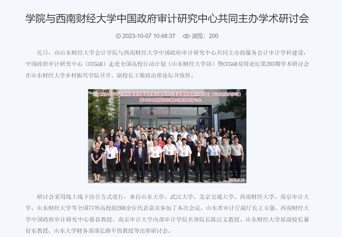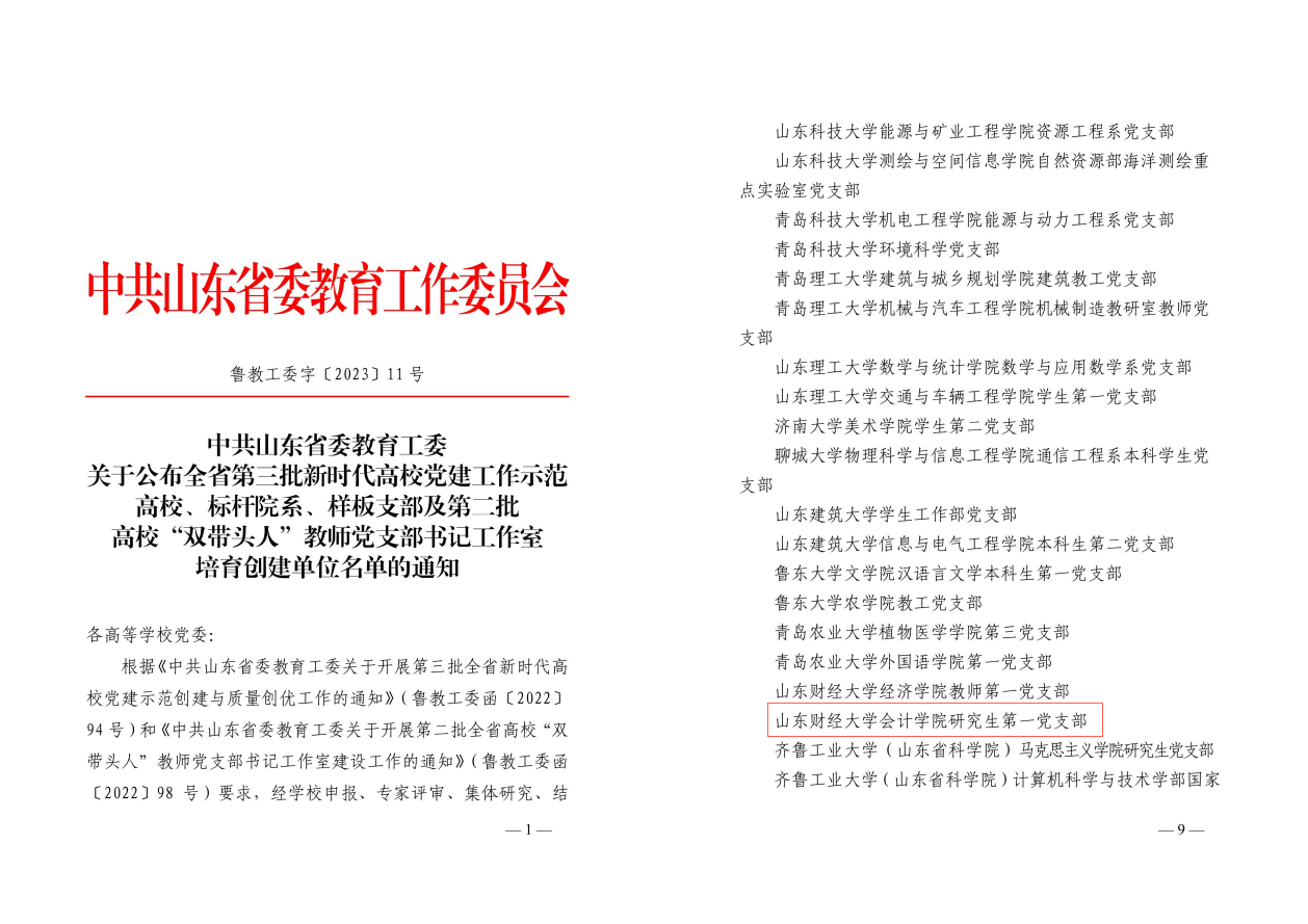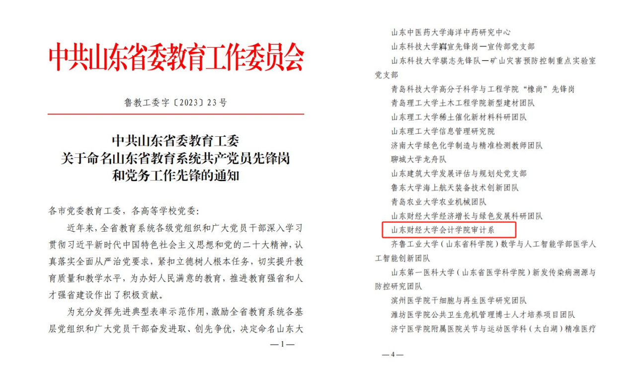 1.发挥党建引领作用。增强基层党组织政治功能和组织功能,持续推进红色会计的挖掘和研究,打造红色会计“特色党建品牌”;2023年8月,免费黄色网站 研究生第一党支部获批山东省第三批新时代高校党建工作样板支部培育创建单位,10月免费黄色网站 审计系获评山东省教育系统共产党员先锋岗。