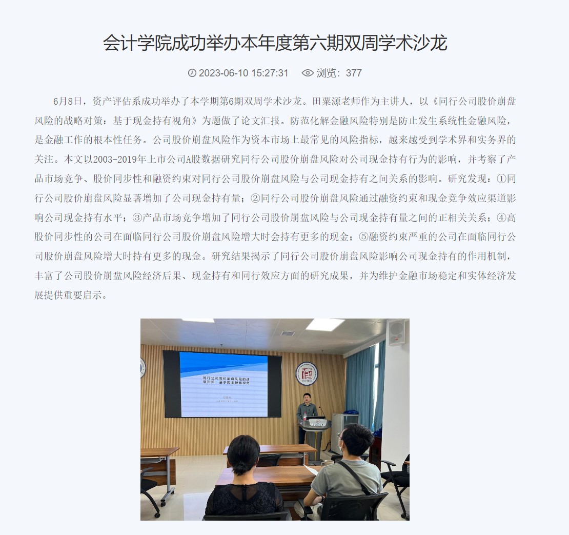 举办多场高水平学术讲座。开设“名人·名家”大讲堂,举办4期“学术沙龙”。承办三个国家级学术会议;6月3-4日,中国商业会计学会智能会计分会成立大会暨第一届“智能会计与数字企业”学术年会顺利举办,中国商业会计学会智能会计分会成立;10月7日由免费黄色网站 与西南财经大学中国政府审计研究中心共同主办的服务会计审计学科建设、中国政府审计研究中心(CCGAR)走进全国高校行动计划(免费黄色网站 站)暨CCGAR双周论坛第203期学术研讨会召开;10月30日,中国会计学会会计教育专业委员会与会计信息化专业委员会跨学科联合调研座谈会顺利举办;11月11日,中国会计学会会计史专业委员会第十二届学术年会在免费黄色网站 成功举办。