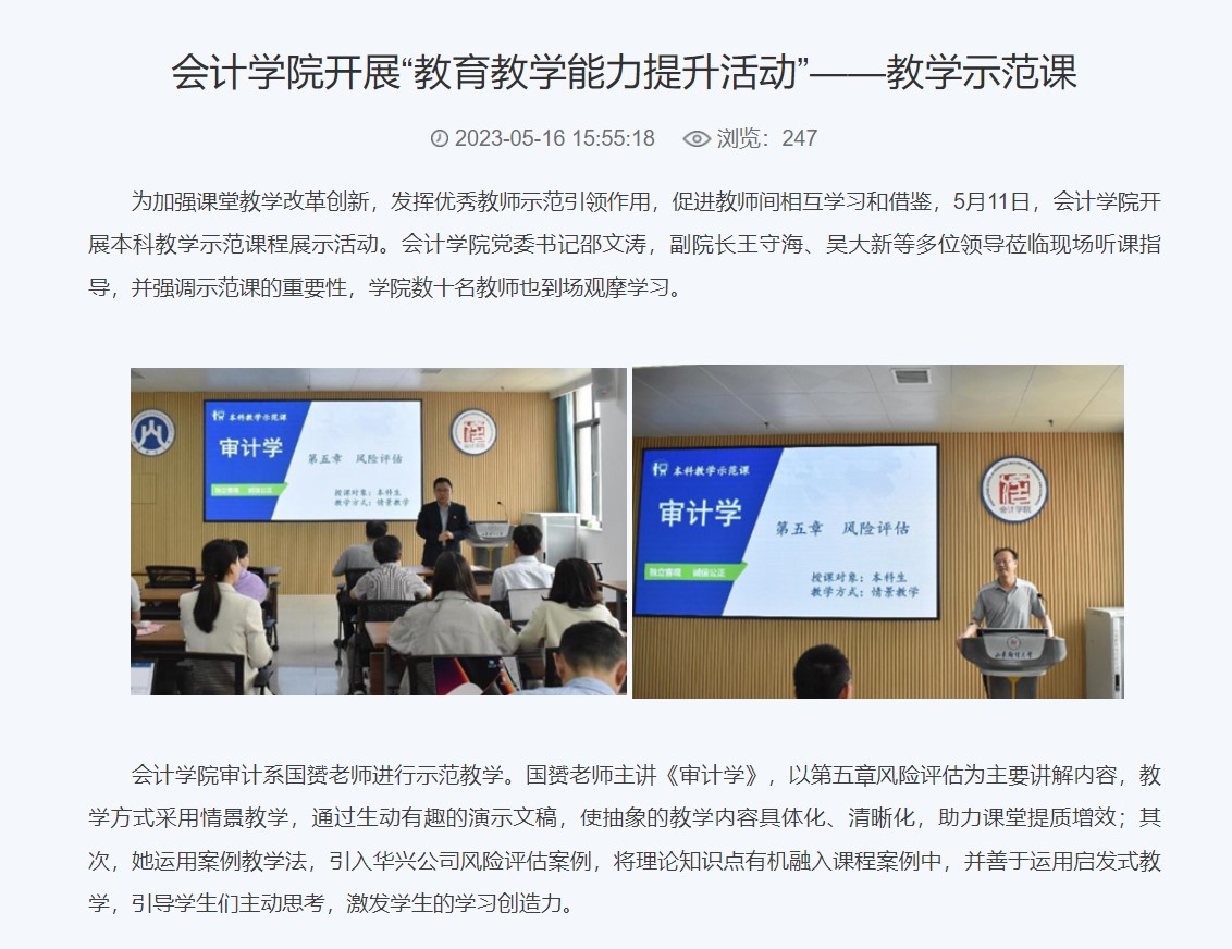 4.积极提升教育教学能力。2023年学院积极推出了教育教学能力提升活动。2023年新增《会计学》《审计学》和《财务管理》三门国家级一流课程。