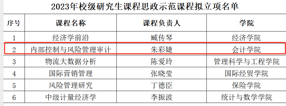 1.立足综合素质目标,强化立德树人培养体系。探索“科技+管理”新型人才培养模式,开设《智能财务分析可视化》《大数据与财务决策》《人工智能与会计发展》《财务机器人》等课程,MPAcc新开设绿色低碳管理及智能会计专业方向课。立项校级研究生课程思政课程1门(《内部控制与风险管理审计》),研究生课程《审计理论与实务》被推荐参评省级课程思政课程。