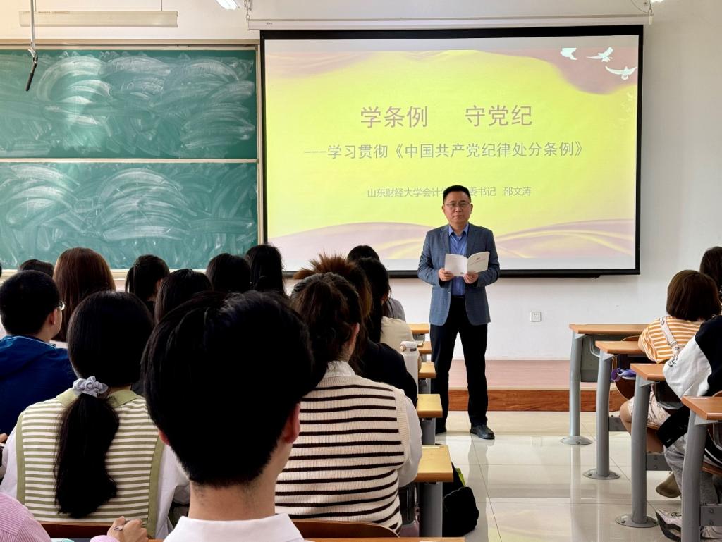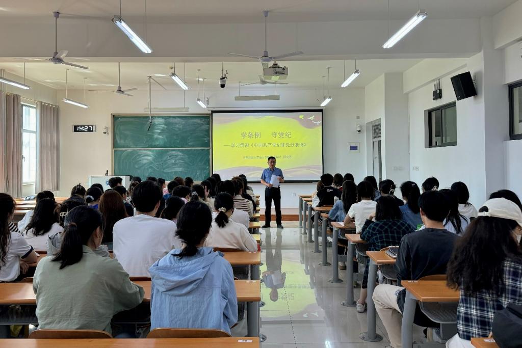 为深入学习贯彻习近平总书记关于党纪学习教育的重要讲话、重要指示精神,学习贯彻党中央决策部署和省委工作要求,不断增强学生党员的责任感、使命感和担当意识,4月25日下午,免费黄色网站 党委书记邵文涛在圣井校区为学生党员讲授“学条例 守党纪”——党纪学习教育专题党课。学院党委副书记钟毓卓,党委组织员、学生第二党支部书记张沫以及圣井校区学生党员参加。