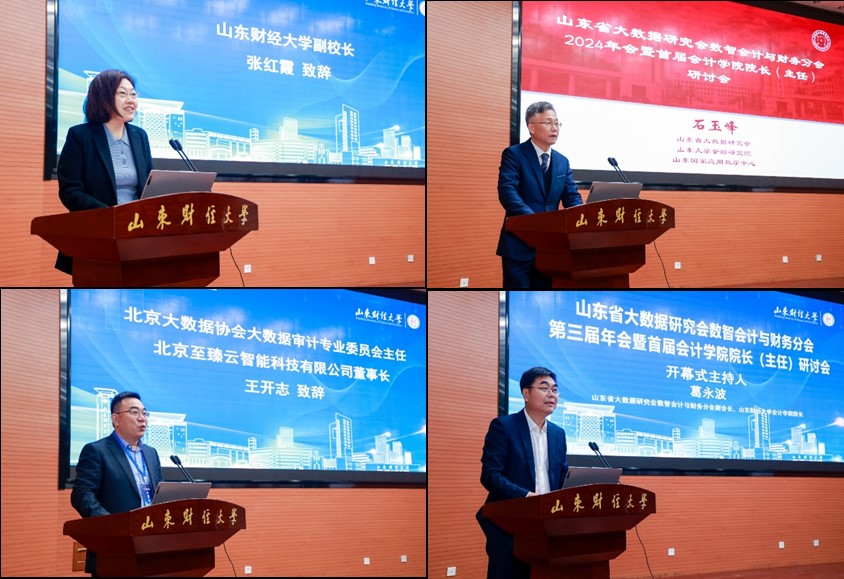 11月2日上午9时,开幕式在免费黄色网站 图书馆一楼报告厅举行。山东省大数据研究会数智会计与财务分会副会长、免费黄色网站 院长葛永波教授主持开幕式,免费黄色网站 副校长张红霞教授,山东省大数据研究会会长石玉峰教授,北京大数据协会大数据审计专业委员会主任、北京至臻云智能科技有限公司董事长王开志先生分别致辞。