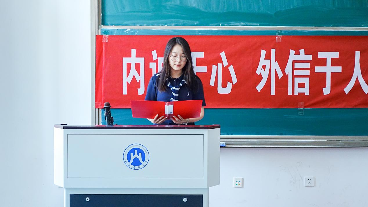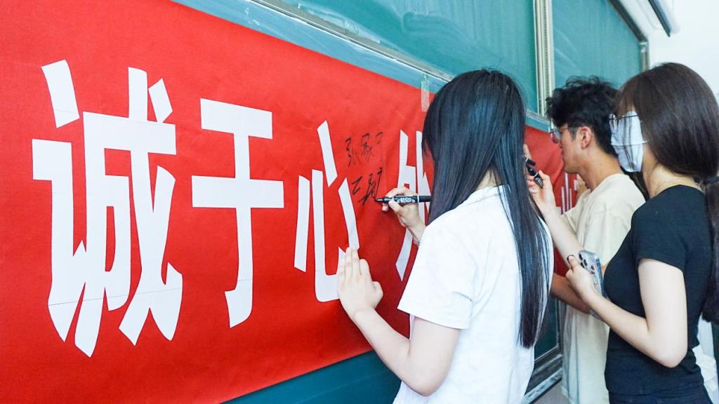 全体与会学生代表依次上台,在“内诚于心,外信于人”的院训横幅上郑重签字,许下诚信考试的诺言。