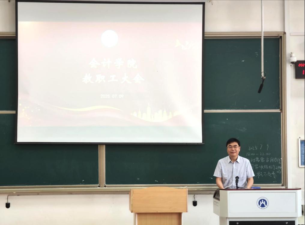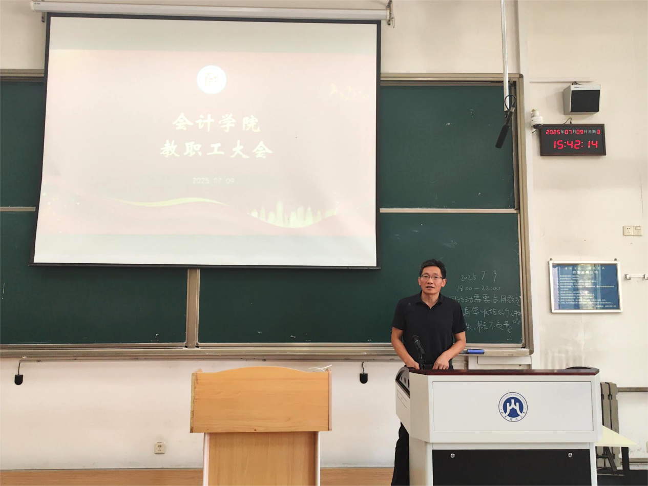 院长葛永波对本学期学院总体工作进行了总结。他表示学院在配合省委巡视、学科建设、教学工作、学术活动、人才引进等方面取得了一定成绩,离不开学院全体教职工的共同努力。葛永波对下一学期学院重点工作进行了部署,他强调,学院正在积极推进AACSB认证以及AAPEQ质量认证工作和会计专业博士授权点的申报准备工作,希望老师们要进一步提升科研热情与干劲,努力增加高水平科研成果,对标2025年学校“一院一书”,为学院高质量发展做出贡献。