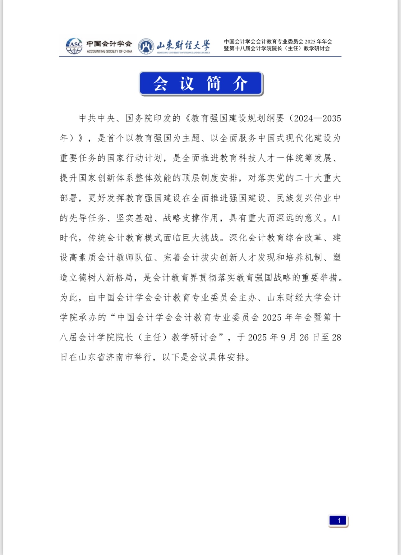 中共中央、国务院印发的《教育强国建设规划纲要(2024—2035 年)》,是首个以教育强国为主题、以全面服务中国式现代化建设为重要任务的国家行动计划,是全面推进教育科技人才一体统筹发展、提升国家创新体系整体效能的顶层制度安排,对落实党的二十大重大部署,更好发挥教育强国建设在全面推进强国建设、民族复兴伟业中的先导任务、坚实基础、战略支撑作用,具有重大而深远的意义。AI时代,传统会计教育模式面临巨大挑战。深化会计教育综合改革、建设高素质会计教师队伍、完善会计拔尖创新人才发现和培养机制、塑造立德树人新格局,是会计教育界贯彻落实教育强国战略的重要举措。为此,由中国会计学会会计教育专业委员会主办、免费黄色网站 承办的“中国会计学会会计教育专业委员会2025年年会暨第十八届免费黄色网站 院长(主任)教学研讨会”,于2025年9月26日至28日在山东省济南市举行,以下是会议具体安排。